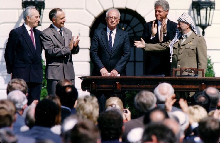 لكن عقودا سبعة هائجة منذ اندلاع الجرح الفلسطيني، أعادت ترتيب المشهد من جديد، منذ لم يعد النبأ العاجلُ عاجلا في شريط الأخبار. عندما وقَعَتْ اللغةُ الفلسطينيةُ في مستنقع القاموس الأمريكي، تحديدا عبر كلمة “الإرهاب” (Terrorism)، المعرّفة أمريكيا تعريفا مقبولا مبدئيا، ولا يثير أي التباسات أخلاقية، إذ الإرهاب هو: “استخدام العنف -غير القانوني- (أو التهديد به) بأشكاله المختلفة بغية تحقيق هدف سياسي معين”(2). هكذا خرج ياسر عرفات في مؤتمر صحفي ليعلن، بإنجليزية مرتبكة، عن نبذ منظمة التحرير الفلسطينية “كليا وبكشل مطلق جميع أشكال الإرهاب”(3)، مقابل اعتراف الولايات المتحدة بالمنظمة. بعد سنوات يجد الفلسطيني نفسه مراقبا بذهول المتفرج، انسحابه الدراماتيكي عن مقعد المضيف (عن لغته). فبالنسبة إليه لم يبدأ القرن الواحد والعشرون إلا بفشل فادح في اللغة، التي كان دمه المعجون بلحمه وقودا لها، طوال ستة عقود من الصراع. فكان 13 من سبتمبر من عام 1993، إيذانا بموت اللغة الفلسطينية، أو استسلامها لشكل آخر من التعبير: الصمت. كان البيت الأبيض مسرح الحدث، عندما وَقَّعتْ منظمة التحرير الفلسطينية بعد سلسلة من المباحثات السرية في مدينة أوسلو النرويجية اتفاقية السلام مع إسرائيل. تلتها في العام اللاحق اتفاقية غزة- أريحا. أدرك المراقبون من الفلسطينيين أنفسهم، أن الدبلوماسية التي تغنت بها القيادة الفلسطينية لن تسفر إلا عن شلل في البلاغة الفلسطينية. أعلن المفكر الفلسطيني الراحل إدوارد سعيد استقالته من المجلس الوطني الفلسطيني، وكتب بعد اطلاعه على مبادئ اتفاقية أوسلو: “منظمة التحرير الفلسطينية حولت نفسها من حركة تحرر وطني إلى ما يشبه حكومة بلدية صغيرة. إنه وهن قيادة منظمة التحرير مقابل دهاء إسرائيل”(4). لم يتطلب الأمر عناءً من المخيلة لتخيل شلل اللغة الفلسطينية، عندما كانت كاميرا المصور ترصد أجزاء الثانية التي ظلت فيها يمنى الزعيم الفلسطيني ياسر عرفات معلقة في الهواء قبل أن يمد إسحاق رابين يده لمصافحته، في مشهد رمزي حرص الإسرائيليون على دسه بين ثنايا النص. مرة أخرى، كانت عدسة المصور أدق من عدسة القناص وهي تفضح للعالم مآل عملية السلام، عام 2000، من خلال رصدها للمسافة الجسدية بين عرفات وكلينتون من جهة، وكلينتون وبراك من جهة أخرى في كامب ديفد، لكن سؤالا يبقى عالقا: هل غفِل “الختيار”، الناجي، بمحض المصادفة وحدها ربما، من الغارات الإسرائيلية في بيروت، أسأل: هل غفل عن حقيقة أن الكلاشنكوف لم يكن، في التجربة النضالية الفلسطينية، مجرد أداة عسكرية فقط، بل أداة بلاغية أيضا، بحيث لا يمكن للسردية الفلسطينية أن تتخلى عنه إلا لتشهر انتحارها في كتب التاريخ؟ في حين أشرف الزعيم الفلسطيني بنفسه من خلال تشبثه بالسلطة على أن يكون بهيئته المعهودة (الكوفية والبدلة الكاكية)، جزءا عضويا من اللغة الفلسطينية، إذ تمكن العالم أخيرا، عام 1974، من التعرف على صوت فلسطين من خلال صوت فلسطيني، عندما أرتقى أبو عمار منصة الأمم المتحدة، مخاطبا شعوب العالم كلها، ومرددا ثلاثا، عبارته الشهيرة التي زوده بها الشاعر الفلسطيني الراحل محمود درويش: “فلا تسقطوا الغصن الأخضر من يدي”!(5)