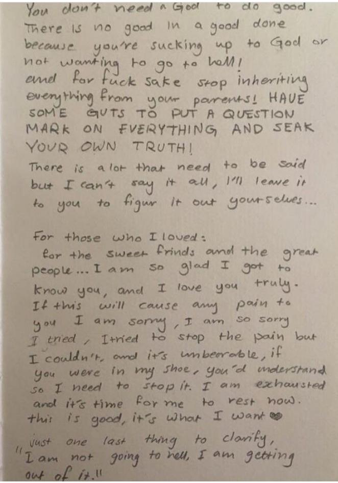 الى الأصدقاء الطيبين والناس العظماء… أنا سعيدة جدًا بفرصة معرفتكم، وأنا أحبكم بصدق. إذا سبب لكم هذا أي أذى فأنا جد آسفة، أنا آسفة جدًا. لقد حاولت، حاولت إيقاف الألم لكني لم أقدر، وهو لا يطاق، لو كنتم مكاني كنتم تفهمتم، لذا لا بد علي من إيقافه. أنا مستنفدة، وقد حان الوقت لأرتاح الآن. هو خير، وهو ما أريده..