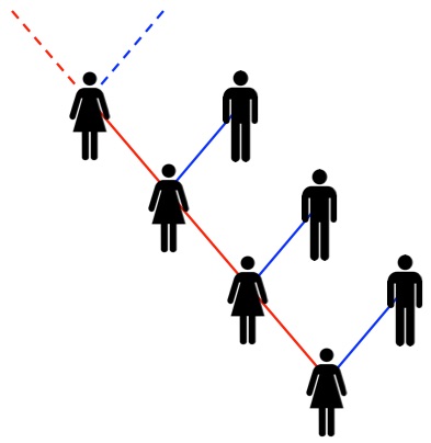 وبالمقارنة، فإنه يصعب تعقّب بقية جينات الكائنات المتكاثرة جنسياً، لأنه في كل جيل يتم التخلص من نصف جيناتنا، بينما يختلط النصف الآخر بجينات شخص آخر (وهذا ما يجعل دناك فريداً). ولذا إنّ أحد ميزات دنا المايتوكندريا هي أنها تبسّط النسب في سلسلة أسلاف واحدة. وبالمناسبة يمكن فعل الشيء نفسه مع الكروموسوم “واي” (Y) لتتبع الخطوط الذكرية.