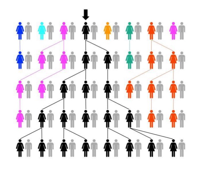 إذن وإن كانت أي مجموعة مميزة جينياً تؤول إلى تلاشي حتمي، فلم توجد أكثر من واحدة؟ هاكم الأخبار الجيدة: بمرور آلاف السنين فإن دنا المايتوكندريا يراكم تغيّرات طفيفة بفعل الطفرات العشوائية، ما يقود إلى القليل من السلالات المميزة. إننا نعيش في شجرة عائلة كبيرة، حيث كل فرع فيها يحوي مجموعات كاملة من الخطوط الأنثوية. ورغم أن بعض الفروع تتوقف، فإنّ بقيتها تتبرعم لفروع جديدة (“جديدة” هنا بمعنى أنّ دنا المايتوكندريا بها مختلف كلياً).
