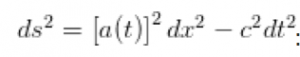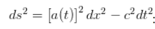 وهي معادلة الفترة الزمكانية ( التي توضح كيفية قياس المسافة في الزمكان) بإضافة صيغة تحجيم ،حيثa(t) هي دالة عامل التحجيم مع الزمن فإذا تضاعفت a(t)، فهذا يعني أن المسافة بين أي نقطتين في المكان قد تضاعفت، وهكذا فإذا استنتجت كيف تتغير دالة عامل التحجيم a(t)بمرور الزمن فإنه يمكنك وصف كيفية توسع أو انكماش الكون بمرور الزمن، تجدر الإشارة إلى أن دالة عامل التحجيم مع الزمن a(t) تصف كذلك الانزياح الأحمر الكوني للضوء، إذ أنه وإذا تضاعفت a(t) فيما بين انبعاث الضوء وامتصاصه، فإن الطول الموجي للضوء (كما الفضاء الذي يسافر من خلاله) ستتضاعف والأطوال الموجية الأكبر ستجنح لاحمرار أكثر، وقد انبعث الضوء الأقدم في الكون عندما كانت a(t) أصغر بألف ومئة مرة مما هي عليه حاليا.