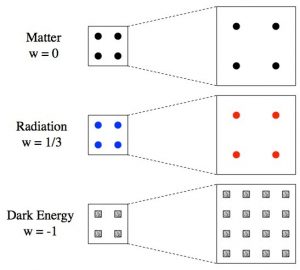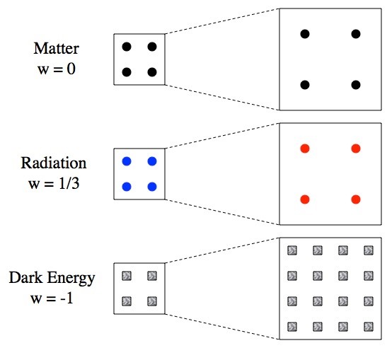 وبتوسع الكون تقل كثافة كل من المادة والإشعاعات، وذلك لوجود مزيد من المساحة لتنتشر فيها، ولكن الإشعاعات لا تنتشر أكثر فحسب، ولكنها تجنح للاحمرار أيضا، وهذا يعني أن كثافة طاقة الإشعاعات تنخفض أسرع من كثافة طاقة المادة المعتادة، وهكذا يمكننا توقع أن (w) وهي تصف مجموع كلا من المادة والإشعاع يجب أن تكون في نطاق . ونظرا لأن توسع الكون يقلل من كثافة طاقة الإشعاعات أكثر منه لدى المادة، فإنه وبمرور الوقت ستتجه قيمة w للاقتراب من الصفر كون المادة تضحى أكثر هيمنة.