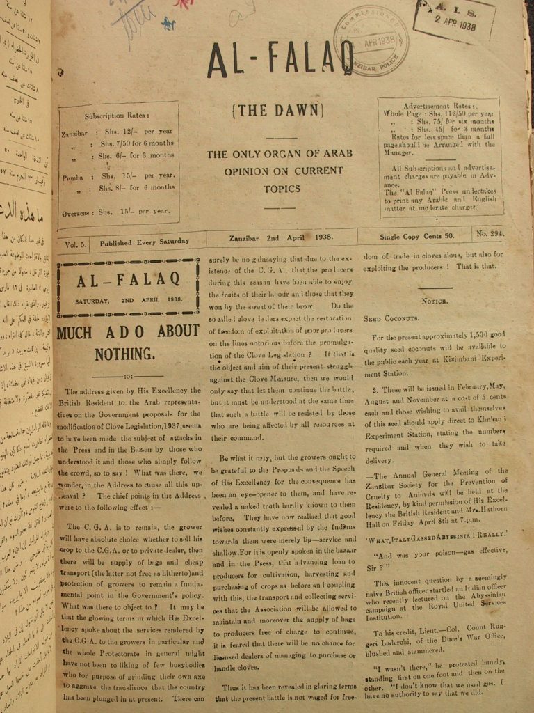 وبحسب الكتاب، فقد صدرت “الفلق” في 4 صفحات، ثم صارت 6 صفحات ثم إلى 8 صفحات، وذلك بعد أن رأى محرروها أهمية مخاطبة العنصر غير العربي من الإنجليز والهنود وبعض الأفارقة، فصدرت باللغتين العربية في أربع صفحات، وباللغة الإنجليزية في أربع أخرى، لتكون في متناول الجاليات غير العربية القاطنة في زنجبار وما حولها آنذاك.