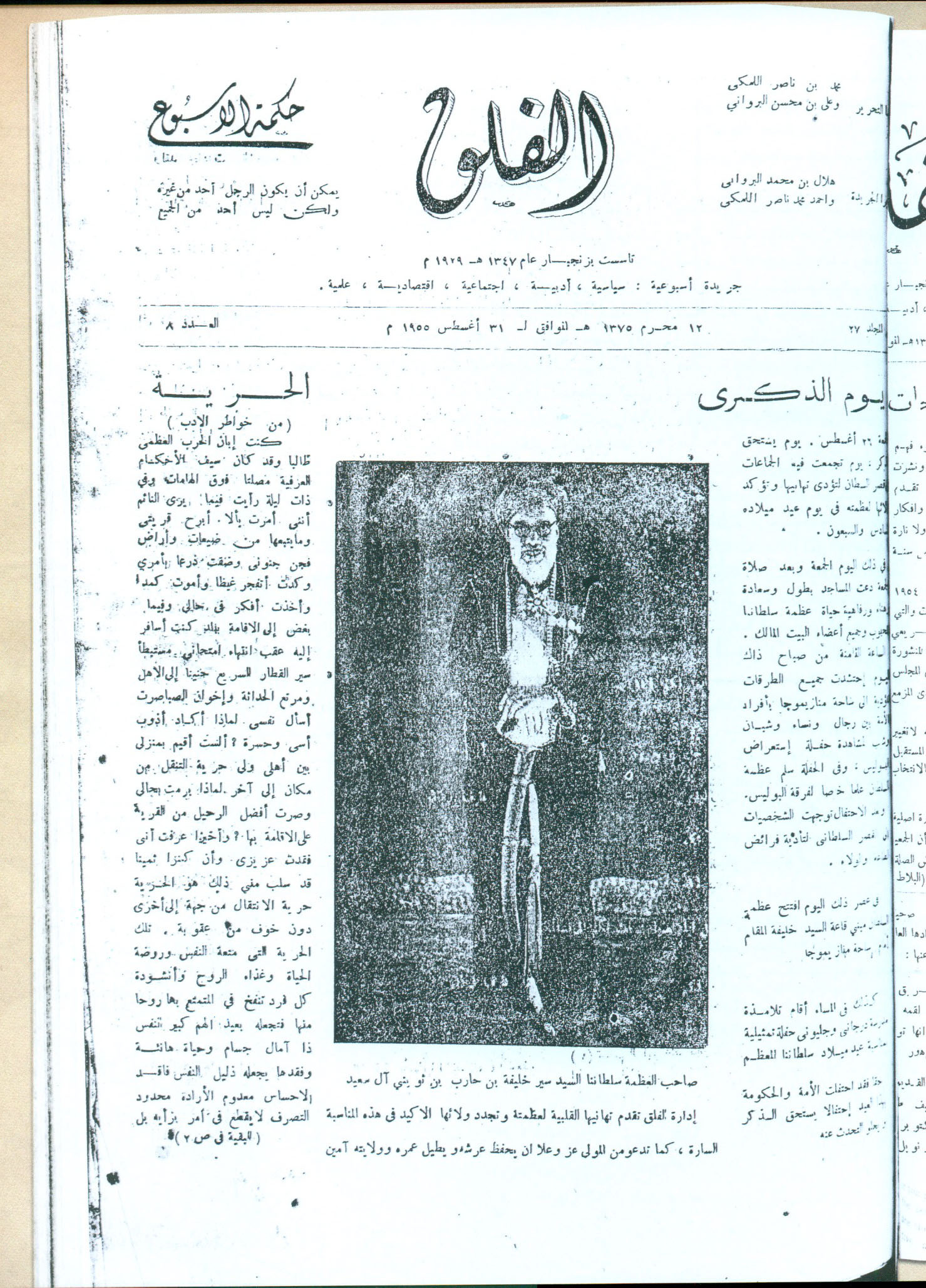 ومع تلك التطورات التنظيمية في بنية الدولة والمجتمع، كان لابد – بحسب مؤلف كتاب “الصحافة العُمانية المُهاجرة وشخصياتها: الشيخ هاشل بن راشد المسكري نموذجاً” – من وجود “صاحبة الجلالة” الصحافة، وصدرت بالفعل بعض الصحف التي كان أشهرها “الفلق”، التي كانت أيضاً أطول تلك الصحف عُمراً، وأغزرها مادة؛ حيث أنها كانت مصبّا لأفكار الكثيرين من أرباب العلم والفكر، وميدانا يتبارى فيه أهل الحكم والقلم، من بين كاتب لمقال إصلاحي أو قائل لقصيدة شعرية، أو طارح لفكرة اجتماعية.